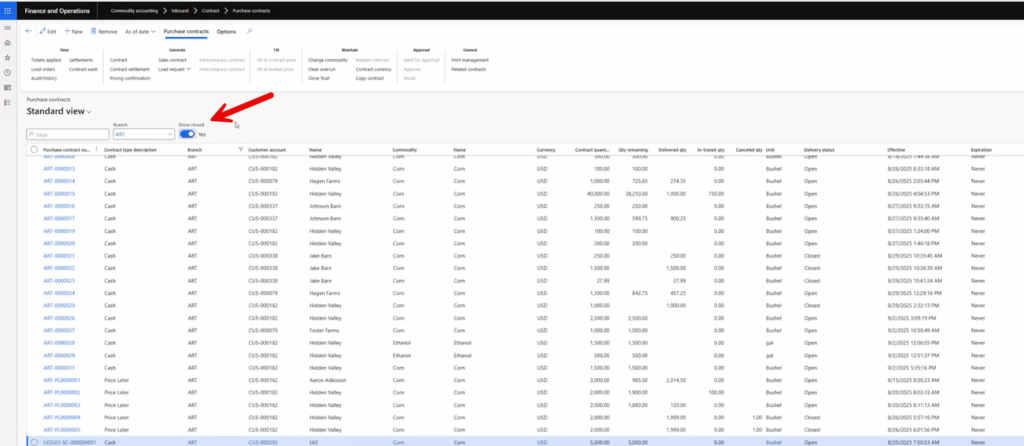 Look for the “Show Closed” filter in your contract and delivery period lists. With a single click, you can reveal closed items alongside open ones, giving you a complete picture of your business activities.