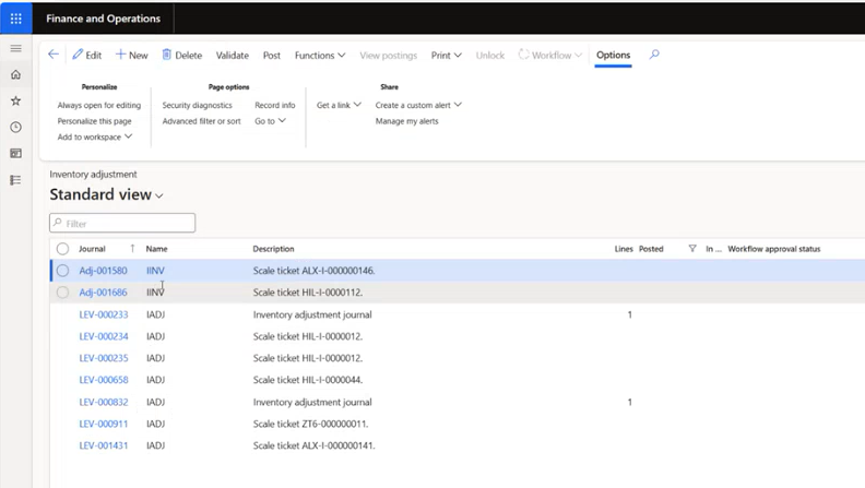 Levridge 2025 Release 2 addresses this need by introducing a dedicated inventory adjustment journal specifically for commodity accounting. This journal provides a clear and customizable way to track inventory adjustments, particularly those related to inbound scale tickets and shrinkage.