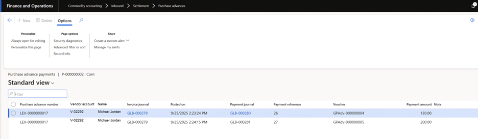 When the user clicks the Payments menu item on the Purchase advance action pane, the Purchase advance payments list page displays: