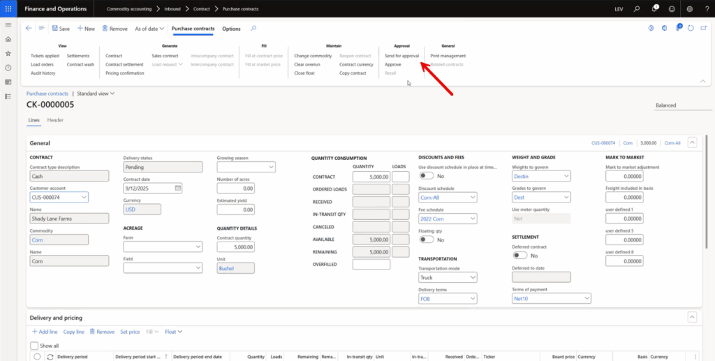 Within the Commodity Accounting Parameters, a new “approval required” column lets administrators specify which contracts need approval—whether it’s a basis or cash contract, purchase or sale, or any combination thereof. This granular control ensures that only the necessary contracts are routed through the approval process, reducing bottlenecks and focusing attention where it’s needed most.